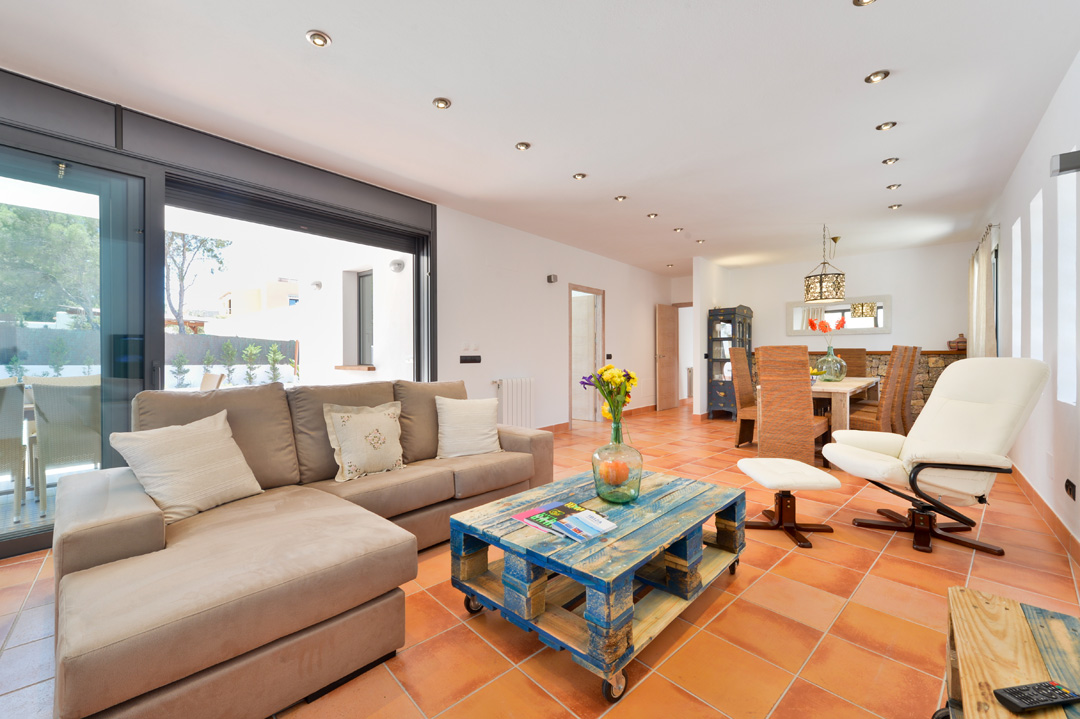 Living room with well-defined TV area and dining area.